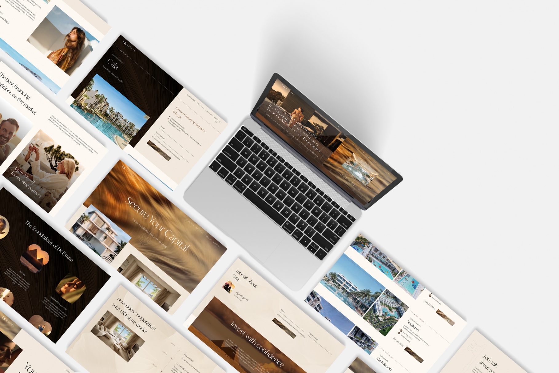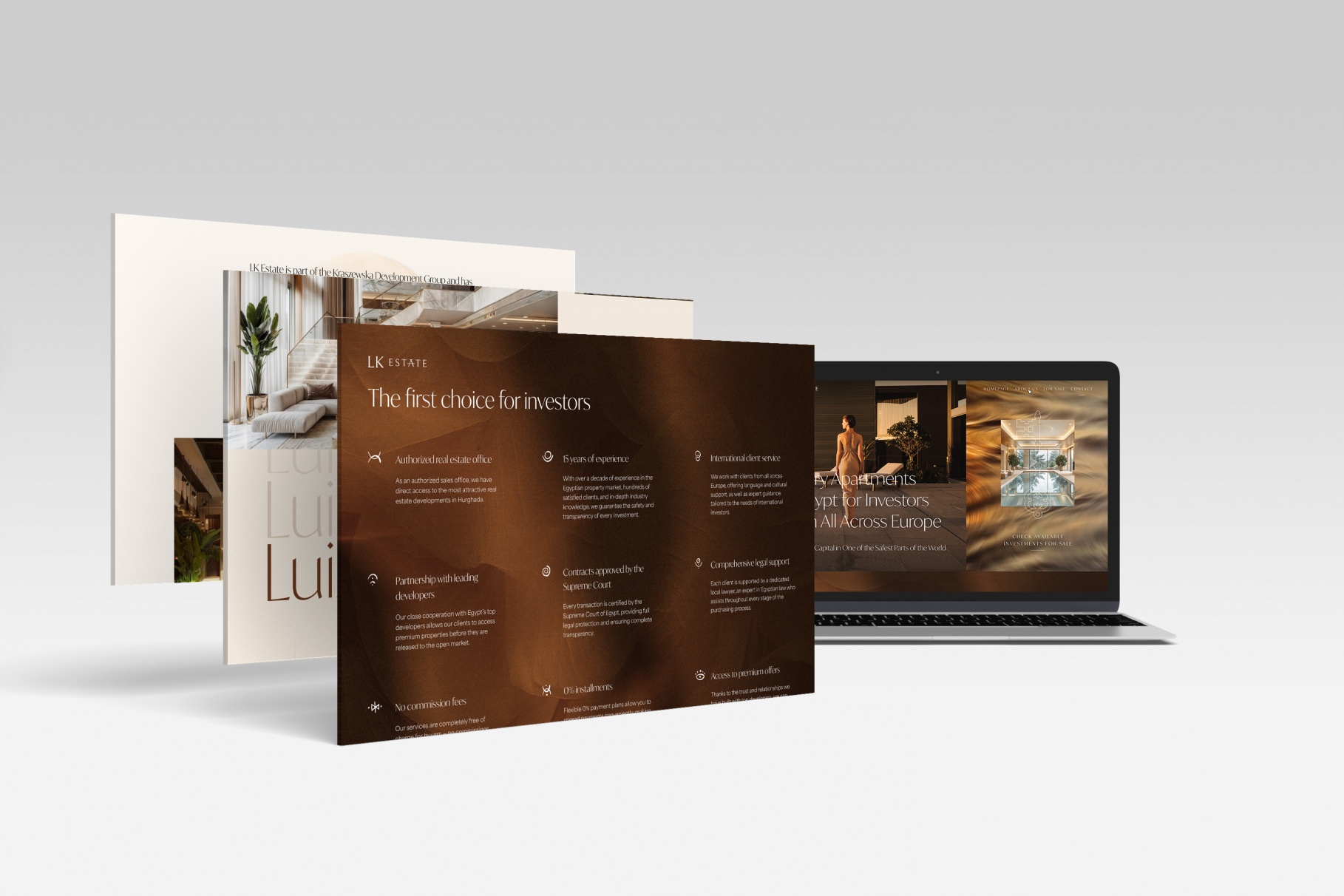 Dla marki LK Estate zaprojektowałam identyfikację wizualną oraz stronę internetową, która przenosi użytkownika w świat prestiżowych inwestycji nad morzem czerwonym. Głównym zadaniem było stworzenie platformy łączącej estetykę luksusowego biura nieruchomości z funkcjonalnością nowoczesnej wyszukiwarki inwestycyjnej. Projekt bazuje na wysokiej jakości materiałach wizualnych, które oddają klimat słonecznego Egiptu, oraz na eleganckim, ciemniejszym layoucie, który podkreśla charakter marki premium. Strona nie tylko prezentuje apartamenty, ale przede wszystkim buduje wizerunek LK Estate jako zaufanego partnera w procesie zakupu nieruchomości za granicą.